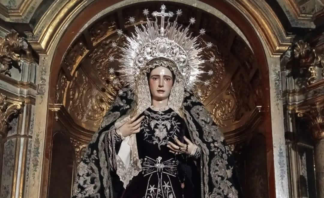 Mes de noviembre, mes en el que por tradición y costumbre se honra a nuestros fieles difuntos. Un año más, nuestra Capilla acoge las tonalidades oscuras, colocando lienzos negros en nuestros Altares. Igualmente, Nuestra Señora de la Soledad acentúa su luto, vistiendo su terno de juego y manto decimonónicos de negro y plata.