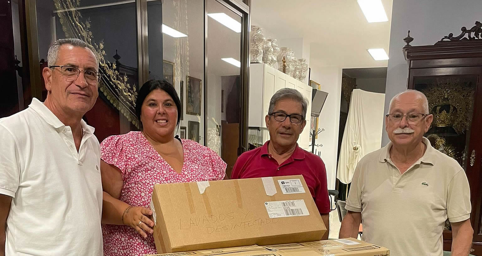 En la instantánea Rosa María Núñez, representante de la asociación, recibiendo la donación, entrega que fue realizada por integrantes de la Junta de Gobierno en la Casa de Hermandad.