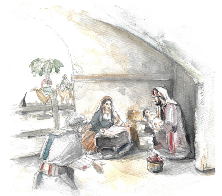 La acuarela es obra de NHD. José María García Gallardo y representa un Nacimiento.