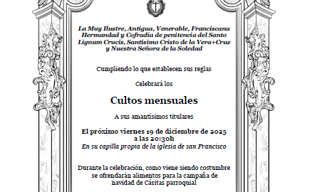 Queridos hermanos: El próximo viernes 19 de diciembre, a las 20:30 horas en la Capilla de la Hermandad, celebraremos Misa de Hermandad en Honor y Gloria de nuestros Titulares. En estos Cultos,Leer más…