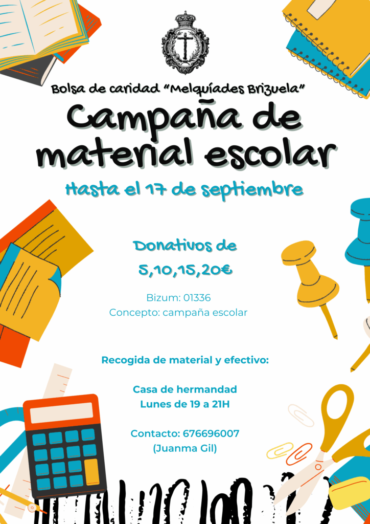 Si algún hermano se encontrase en situación de no poder acceder a material escolar, puede contactar a través de caridad@veracruzcadiz.es o 676696007 siendo la información estrictamente confidencial.