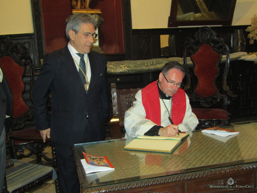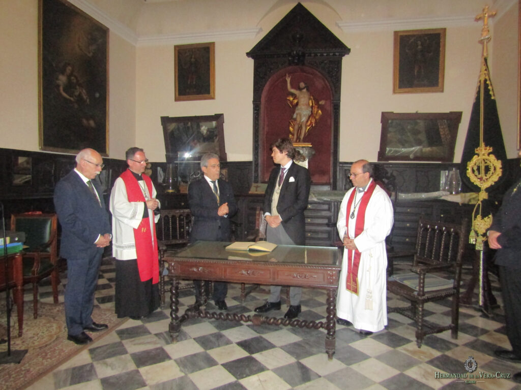 Tras consumarse el ritual, la comitiva retornó a la Sacristía del convento a los sones de Mi Cristo Dormido, lugar que acogió el acto de firma en el Libro de Honor de la Hermandad de todas las personalidades que asistieron al acto. En primer lugar, el pregonero de la Semana Santa, NHD. Miguel Angel Sastre Uyá quien reiteró su mensaje dado durante el Pregón matinal sobre los valores adquiridos de sus vivencias en nuestra Hermandad.
