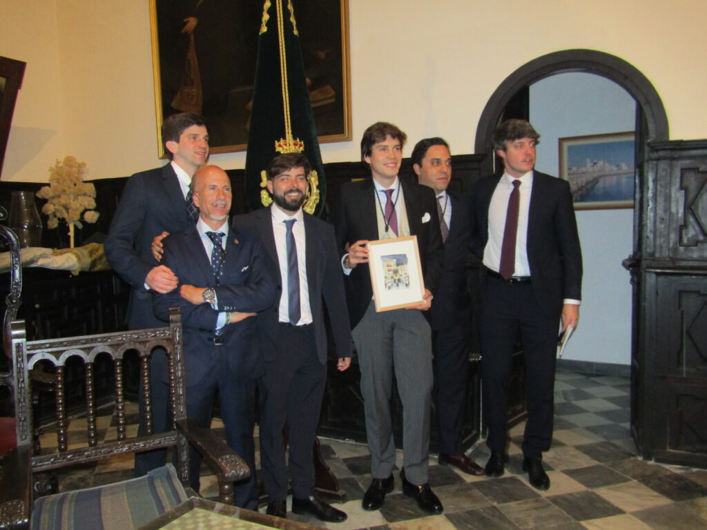 Finalmente, el pregonero recibió un presente de un grupo de hermanos que coincidieron con él en el Grupo Joven de la Hermandad y que consistía en una bonita acuarela que ilustraba el cuerpo de acólitos del cortejo procesional al que perteneció Miguel Ángel muchos años, a su paso por plaza del Palillero durante la Estación de Penitencia.