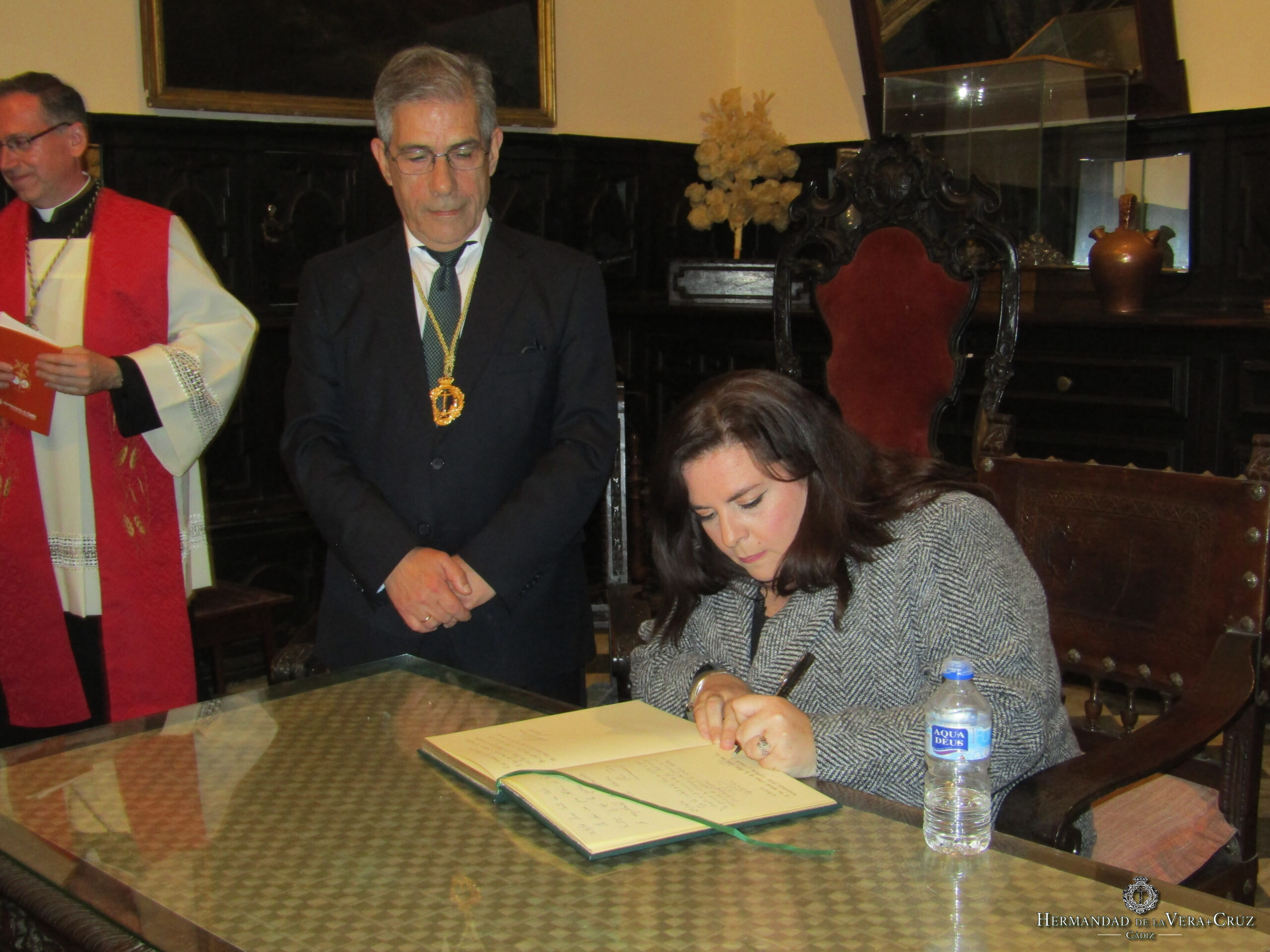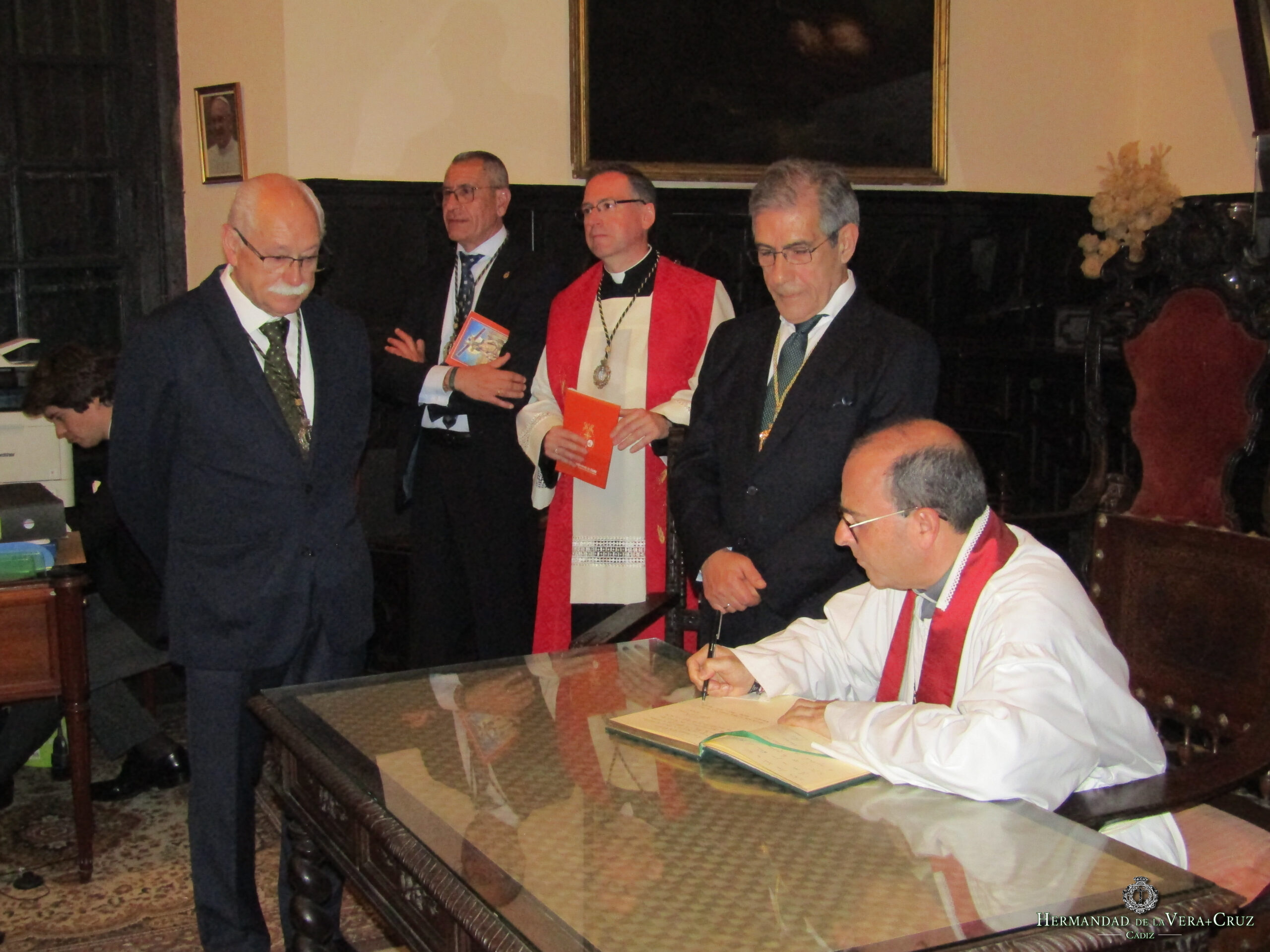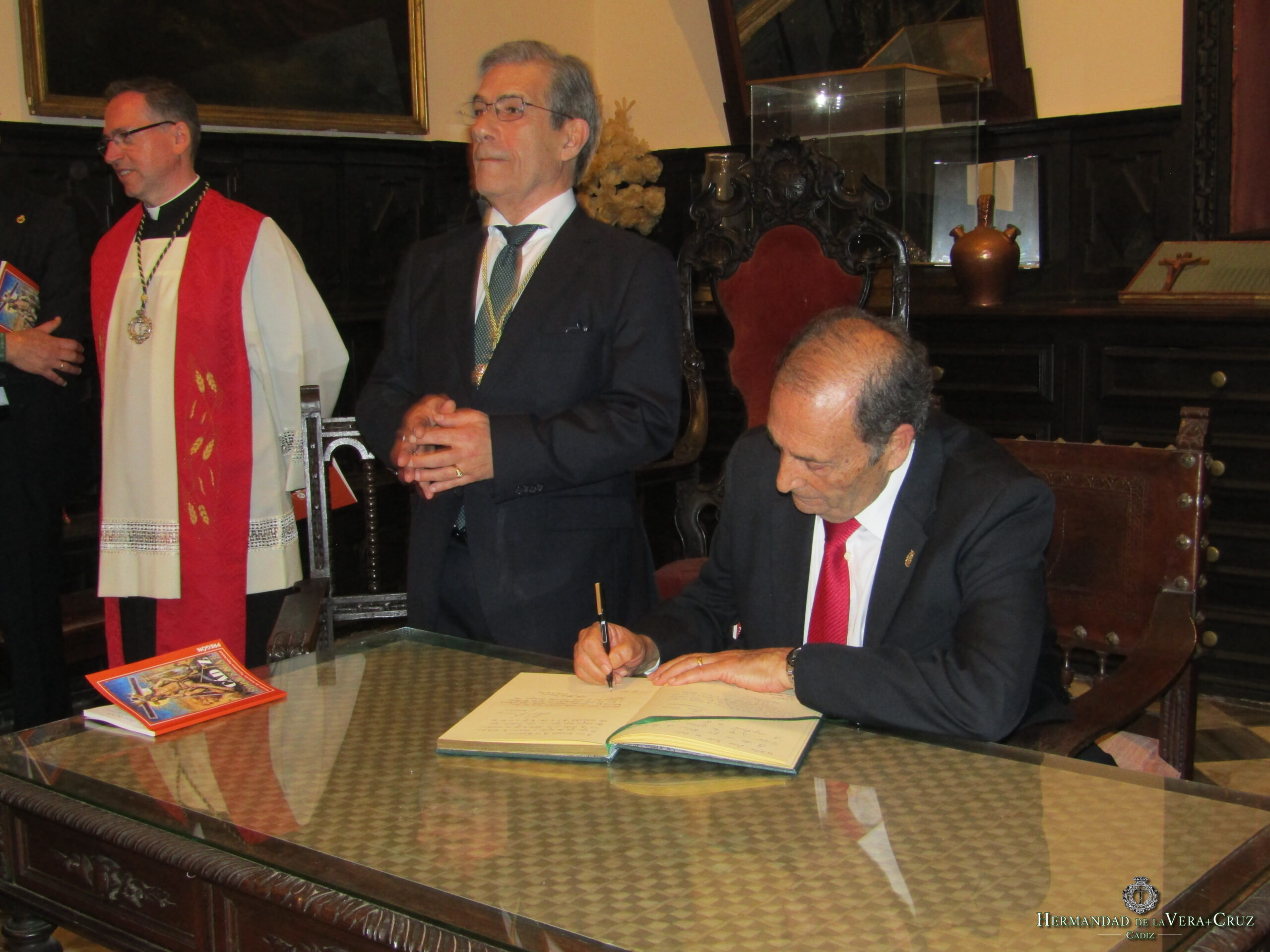 Tras consumarse el ritual, la comitiva retornó a la Sacristía del convento a los sones de Mi Cristo Dormido, lugar que acogió el acto de firma en el Libro de Honor de la Hermandad de todas las personalidades que asistieron al acto. En primer lugar, el pregonero de la Semana Santa, NHD. Miguel Angel Sastre Uyá quien reiteró su mensaje dado durante el Pregón matinal sobre los valores adquiridos de sus vivencias en nuestra Hermandad.