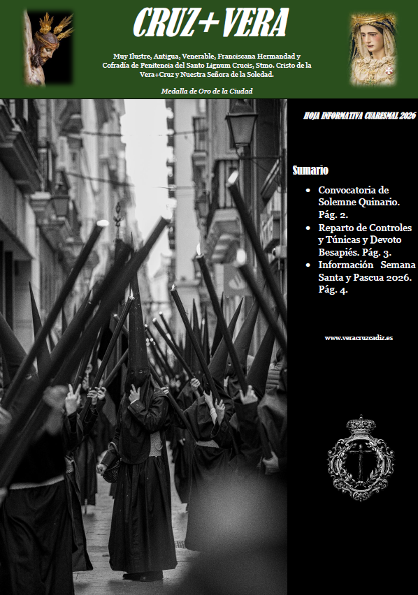 «Cruz+Vera» es la publicación que edita anualmente la Hermandad dirigida a informar a los hermanos de los actos más importantes y relevantes de cada Tiempo de Cuaresma.