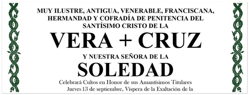 Por ello, y nuevamente al igual que el pasado año de manera extraordinaria, los Solemnes Cultos de nuestra Hermandad se adelantan una jornada, comenzando los mismo el jueves 13 de septiembre en la Víspera de la Festividad de la Exaltación de la Santa Cruz, donde celebraremos Solemne Misa a las 20’30 horas en el Altar Mayor del Convento. La predicación correrá a cargo del Rvdo. Pdre. D. Enrique Soler Gil, Pbro., Cura Párroco de la San Juan Grande y Nuestra Señora de la Candelaria, en Jerez de la Fra. (Cádiz).