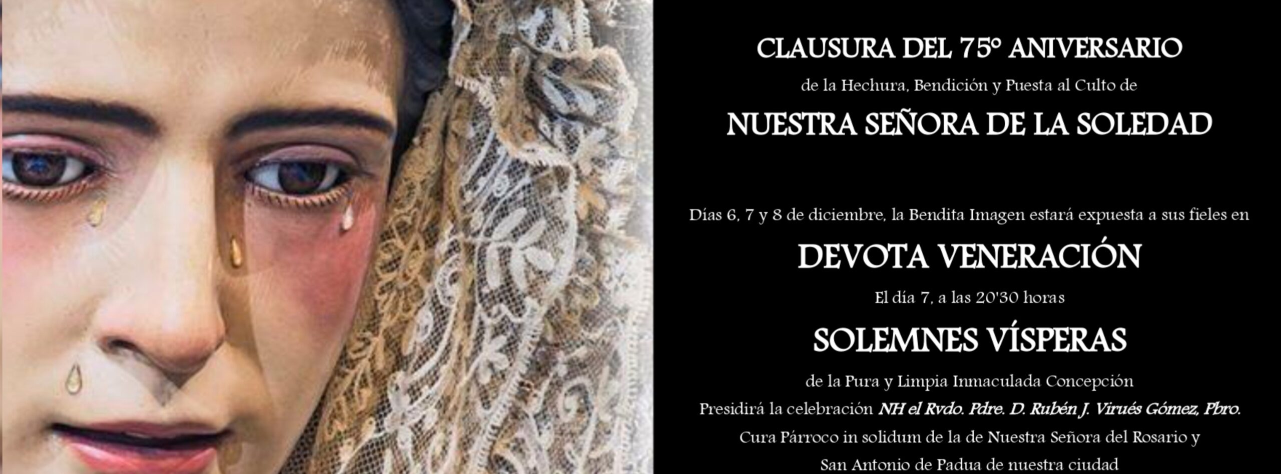 Los próximos días festivos la Hermandad organiza los Cultos y Actos de Clausura del 75º Aniversario de la Hechura, Bendición y Puesta al Culto de Nuestra Señora de la Soledad.
