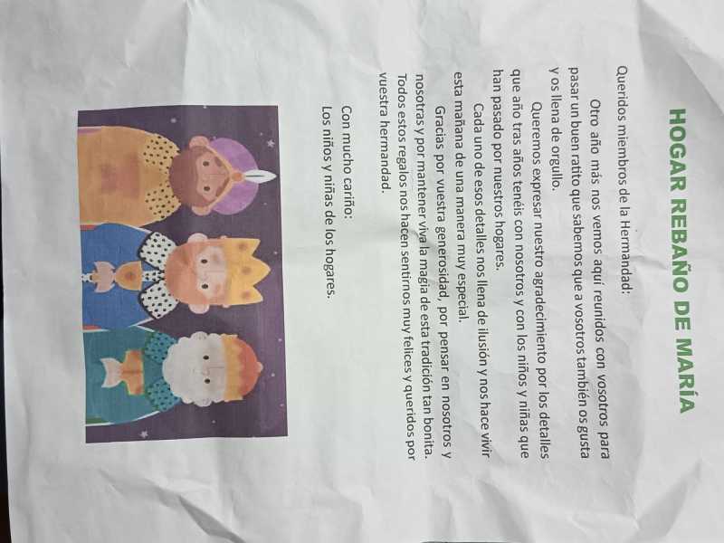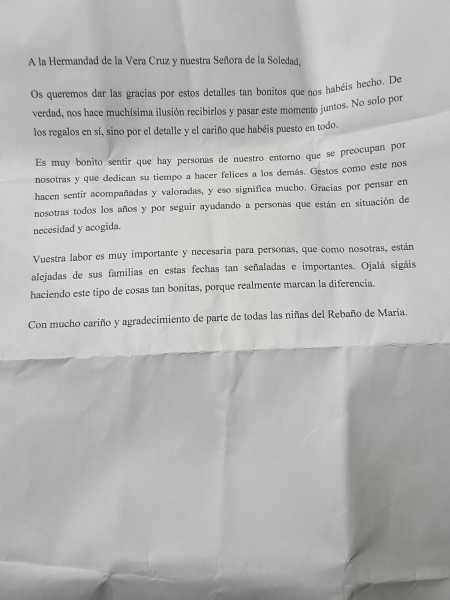 El pasado sábado, 13 de diciembre, se realizó la tradicional entrega de regalos a los niños residentes en el Rebaño de María. El acto lo abrió NHD. Juan Manuel Gil Riego, vocal de Caridad, dando la bienvenida y presentando al Hermano Mayor, NHD. Pablo Jaime Castellano Marrero, que tomó la palabra. Seguidamente nuestro director espiritual el Rvdo. Sr. D. Rubén Jesús Virués Gómez dirigió el rezo del Ángelus. Tras ello y para finalizar, dos niñas tomaron la palabra y leyeron una carta.