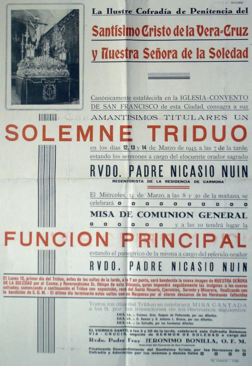En dicho día salió la cofradía el año de 1945, ello se debía a que intercambió su lugar con la cofradía de la VOT de Servitas, al estar planificando ambas juntamente la realización de un acontecimiento con el fin de recabar fondos.