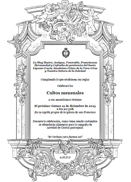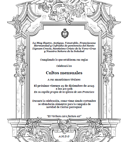 El próximo viernes 19 de diciembre, a las 20:30 horas en la Capilla de la Hermandad, celebraremos Misa de Hermandad en Honor y Gloria de nuestros Titulares.
