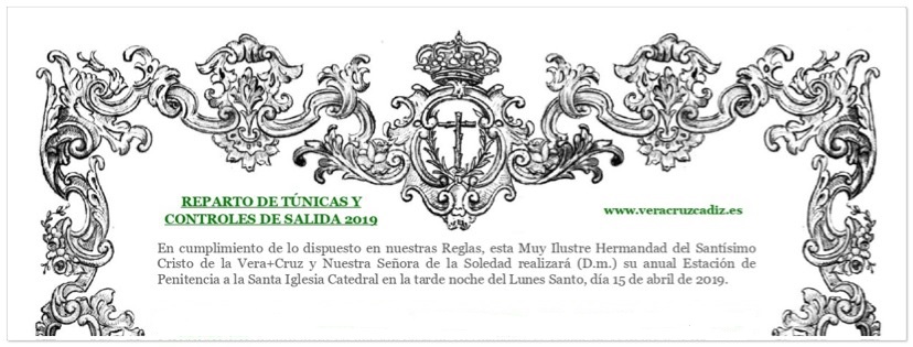 En cumplimiento de lo dispuesto en nuestras Reglas, esta Muy Ilustre Hermandad del Santísimo Cristo de la Vera+Cruz y Nuestra Señora de la Soledad realizará (D.m.) su anual Estación de Penitencia a la Santa Iglesia Catedral en la tarde noche del Lunes Santo, día 15 de abril de 2019.