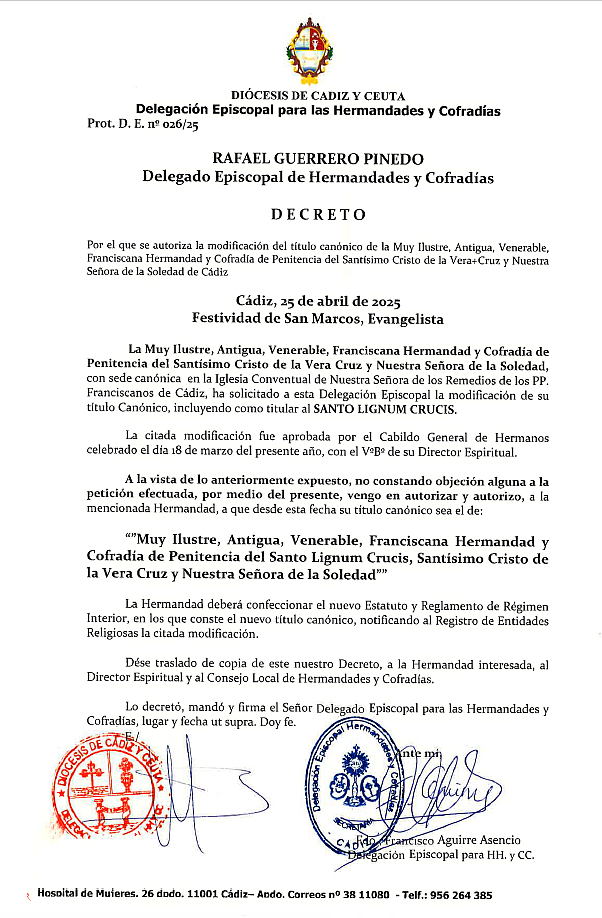 Por mediación de Decreto dimanante de la citada Delegación se ha aprobado la solicitud el día de hoy 25 de abril de 2025, Festividad de San Marcos Evangelista, actualizándose el título de nuestra Hermandad al siguiente: