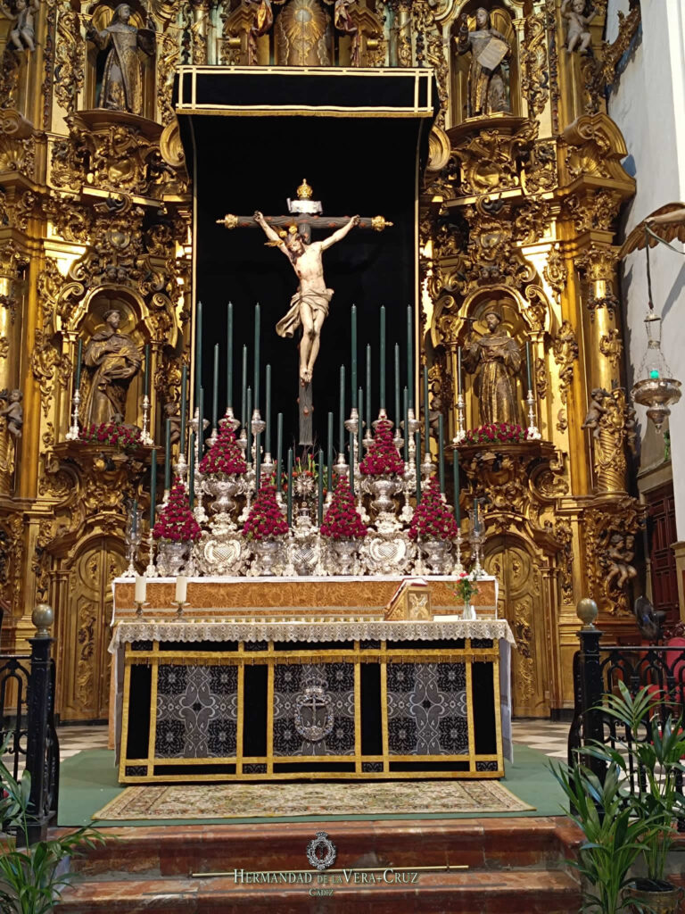Presidido por la Sagrada Reliquia del Lignum Crucis y la Imagen del Titular, el altar se ilumina con treinta puntos de luz en una escalera de cera conformada por candeleros del paso de Nuestra Señora de la Soledad, obra de los Talleres de Hermanos Espinosa. En los espacios, diversas cartelas de alpaca plateada realizadas en los años cincuenta en los Talleres de Seco Velasco.