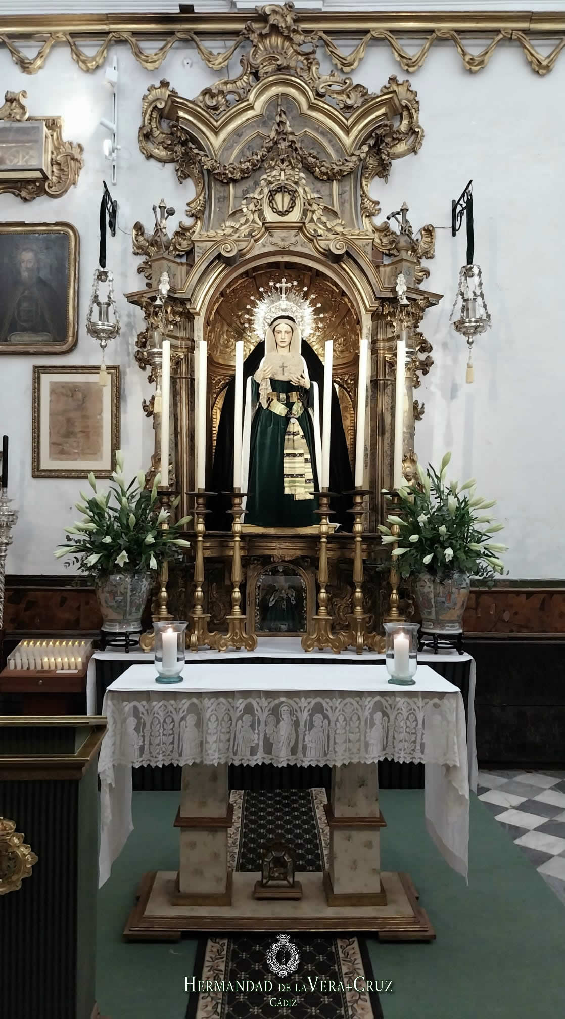 Destacar que el Altar de Nuestra Señora de la Soledad presenta cuatro candeleros de madera dorada con cirios blancos, mantelería blanca y flanqueado con longuifloros y azucenas.