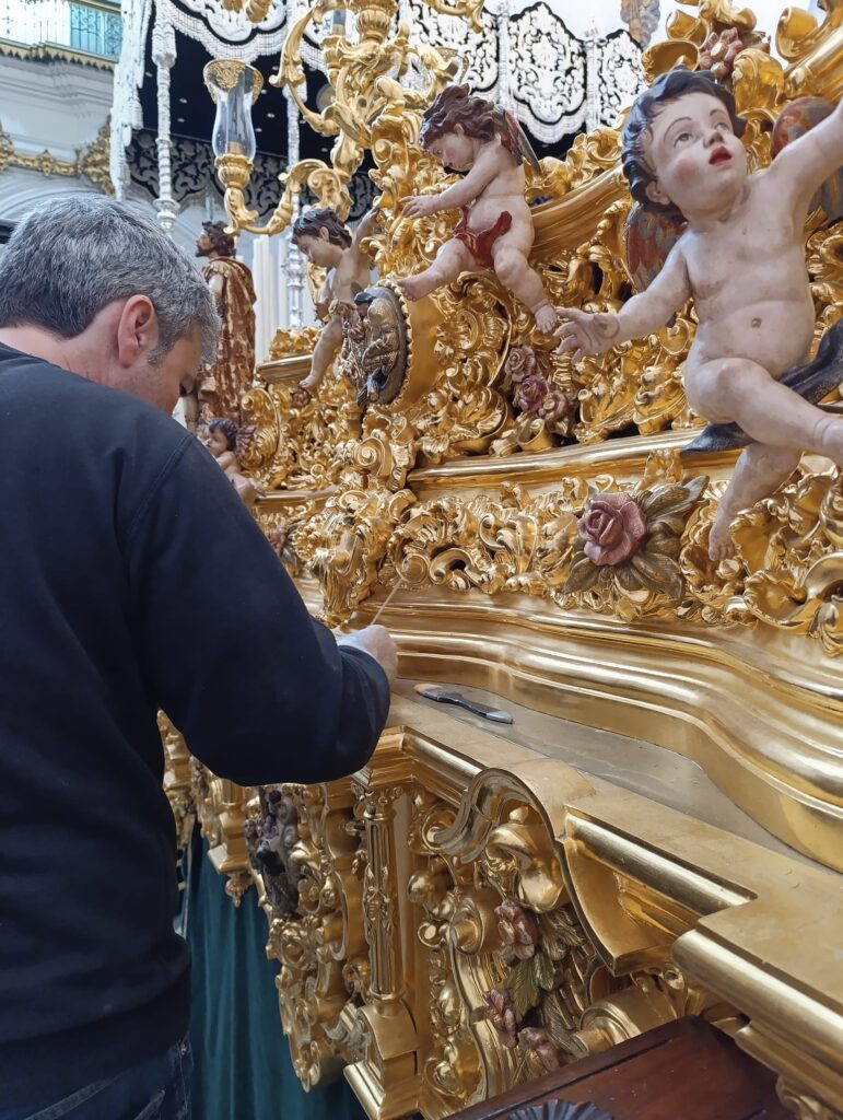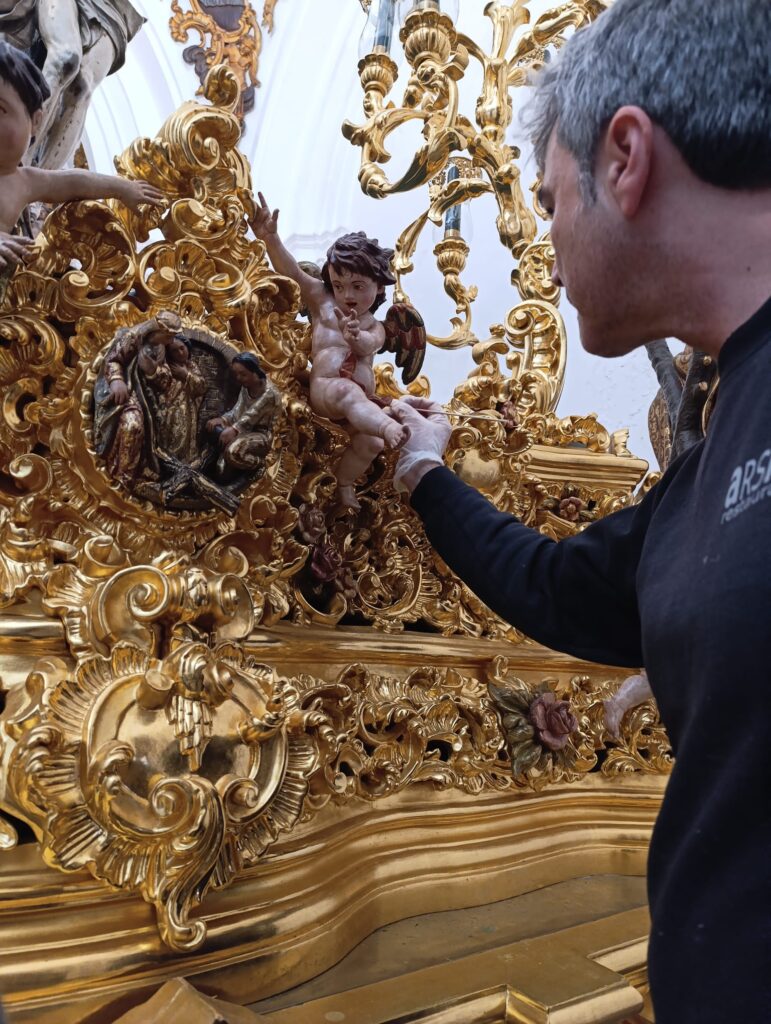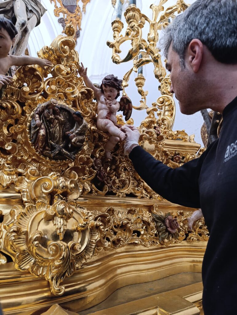 Como es costumbre en nuestra Hermandad durante la semana de Pasión la empresa Ars Nova, restauración de Bienes culturales, S. L., ha llevado a cabo en la mañana del día de hoy martes labores de adecentamiento y conservación en el Paso del Santísimo Cristo de la Vera+Cruz.