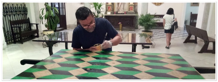 Por tal motivo, la Comunidad Parroquial de San Antonio ha tenido a bien, de manos del artista D. Miguel Ángel García Saucedo, restaurar la parihuela antes de entregarla a nuestra Hermandad. Cabe destacar, que el propio García Saucedo tiene cierta vinculación con nuestra Cofradía, pues suyas son las pinturas de nuestro Banderín Franciscano y Asuncionista (Insignia esta última que ya no procesiona).