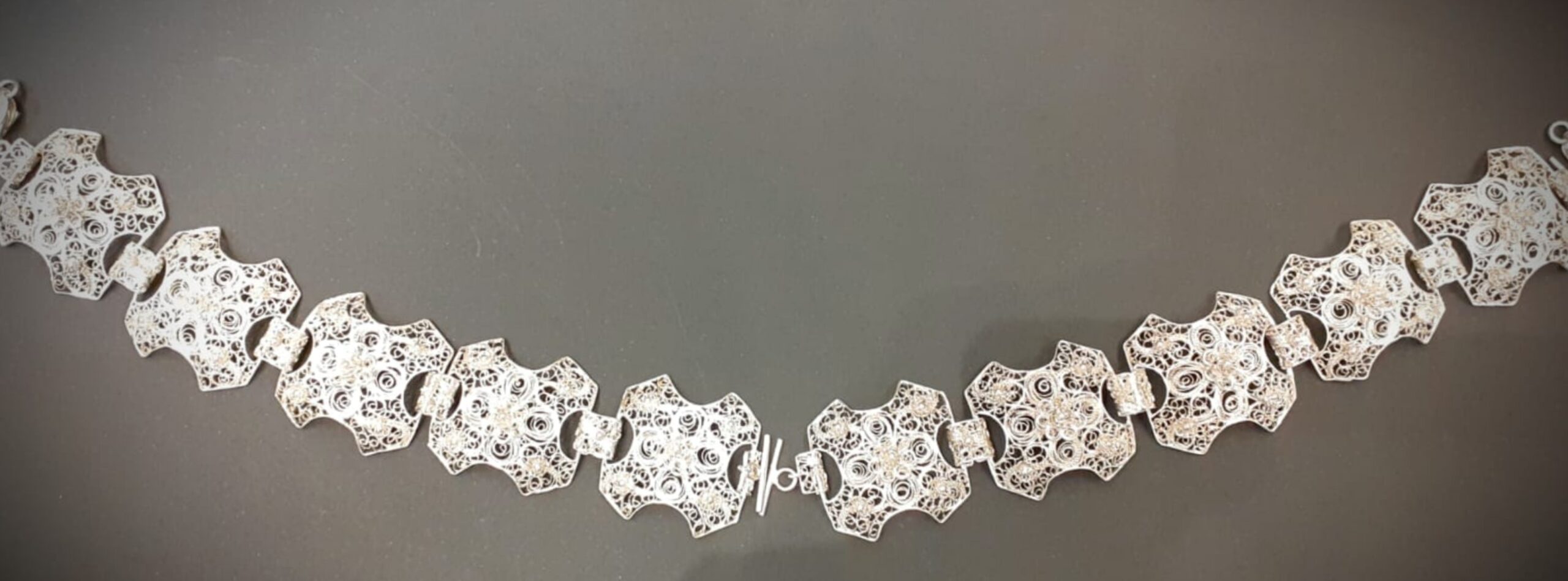 Se trata de una Pulsera de filigrana, de plata, realizada por el Joyero, Artesano y Gemólogo D. Pedro del Río Macanaz.