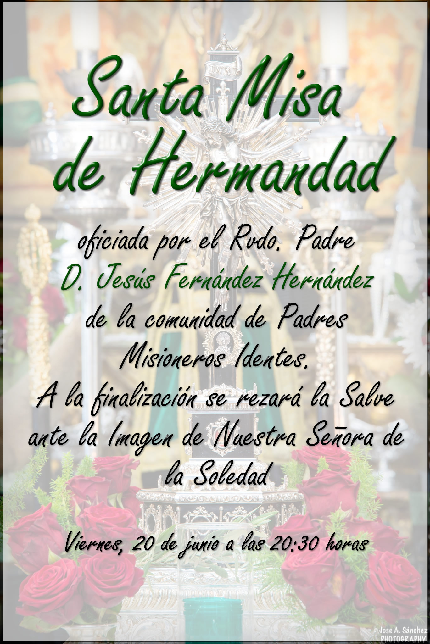 Recordarte que el próximo viernes día 20 y tercero del mes de junio, la Hermandad celebrará sus Cultos mensuales que darán comienzo a las 20:30 horas en nuestra Capilla de la Iglesia de San Francisco, cantándose a su finalización la Salve ante la Imagen de Nuestra Señora de la Soledad. La Santa Misa estará oficiada por el Rvdo. Padre Jesús Fernández Hernández, de la comunidad de Padres Misioneros Identes del convento de San Francisco.